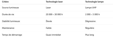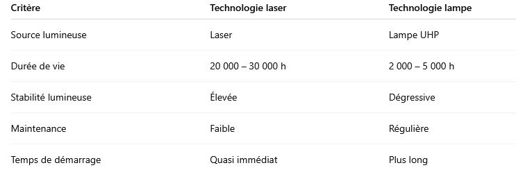 Un vidéoprojecteur laser offre une durée de vie moyenne comprise entre 20 000 et 30 000 heures, contre 2 000 à 5 000 heures pour une lampe classique.